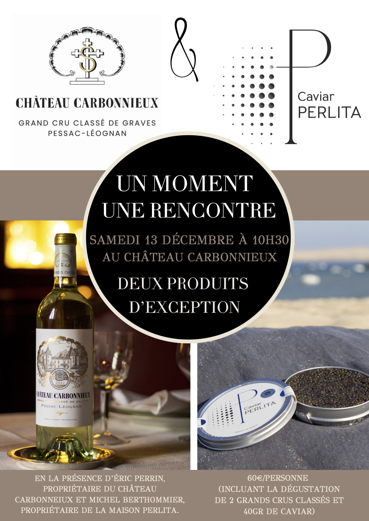 Un atelier exclusif et intimiste pour savourer les vins blancs du Château Carbonnieux en harmonie avec les caviars de la Maison Perlita.